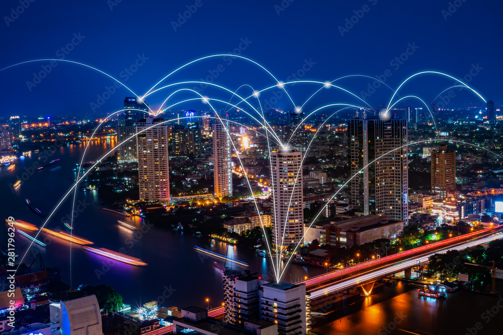 5G and 6G network digital hologram and internet of things on city background.5G and 6G network wireless systems.