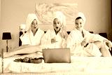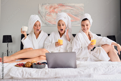 Young astonished women in white bathrobes and towels on head amazidly looking at laptop together. Pretty girls holding orange juice and cup of coffee in hands having breakfast in bed in hotel