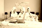 Young attractive smiling women in white bathrobes and towels on head happily talking together with laptop near. Pretty girls drinking orange juice and coffee having breakfast in bed in hotel