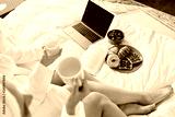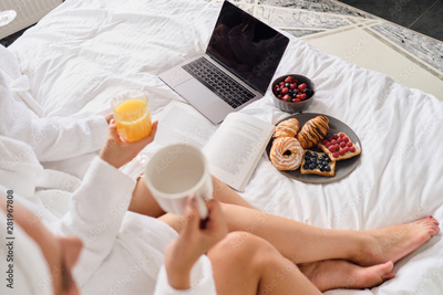 Close up photo of women holding glass of juice and cup of coffee with laptop,book and beautiful breakfast in bed in modern cozy hotel