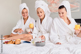 Young pretty smiling women in white bathrobes and towels on head happily reading book together. Attractive girls drinking orange juice having breakfast in bed in modern cozy hotel
