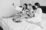 Group of young smiling women in bathrobes holding glasses with red wine in hands happily taking photos on cellphone together. Beautiful girls having breakfast in bed in modern cozy hotel
