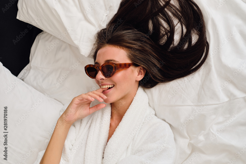 Young pretty smiling woman with dark hair in white bathrobe and sunglasses dreamily bite finger lying on big bed in modern hotel