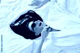 Young emotional smiling woman with dark hair in white bathrobe and sunglasses joyfully looking aside lying on bed in modern hotel