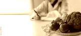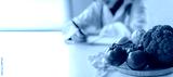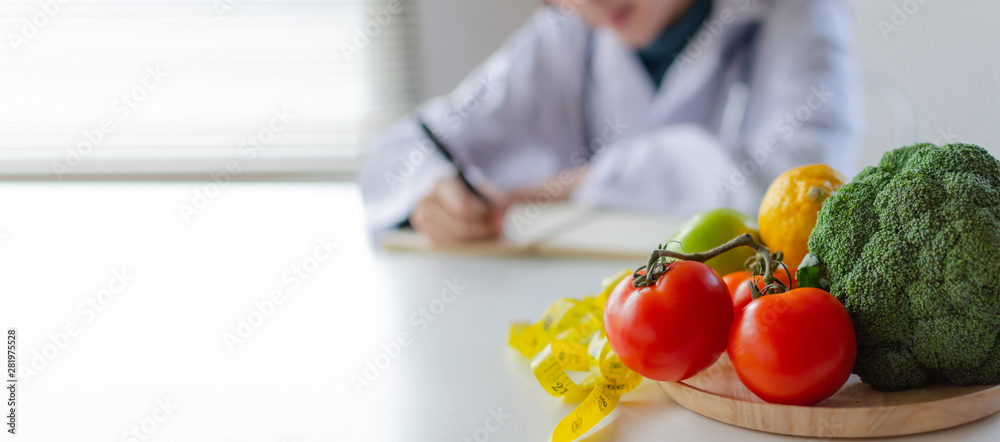 panoramic banner. focus fresh vegetables and fruits with nutritionist female doctor, medical writing diet plan on desk at office in background, healthcare, lifestyle, healthy food and dieting concept