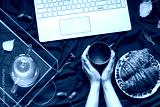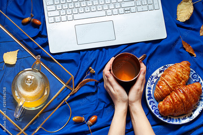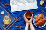 Woman's hands are holding a cup of tea while working on the computer. Deep blue autumn concept flat lay with a laptop, fall leaves and a snack. Breakfast in bed top view composition