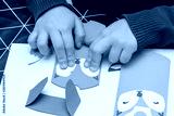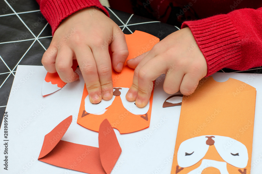 Children's hands make Christmas paper crafts. Child art project. DIY concept.