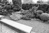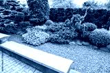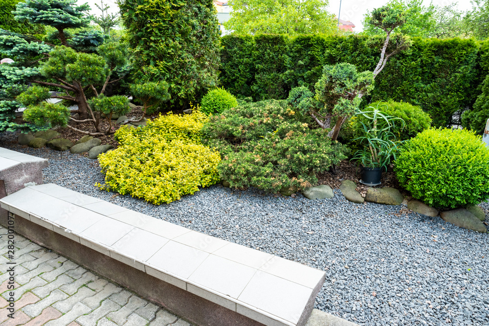 evergreens with gravel in the decoration of the flowerbed in landscaping