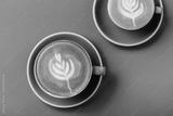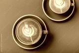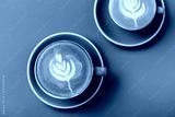 Cyan cappuccino coffee cups over orange background. Top view flat lay with copy space