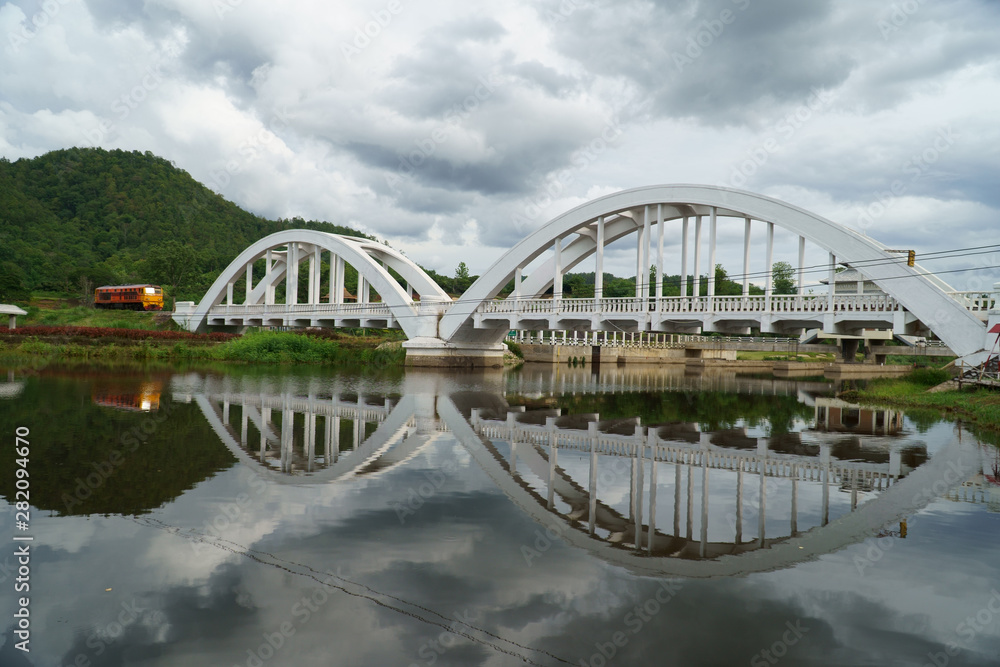 Diesel locomotive passing the Tha Chom Phu railway bridge or white bridge