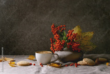 Cup of espresso coffee standing on linen table cloth with yellow autumn leaves, berries in ceramic vase, coffee beans and shortbread cookies with dark wall at background. Fall concept. Copy space