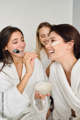 Three young cheerful women in white bathrobes sitting on bed happily making cosmetic mask together in modern cozy hotel
