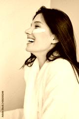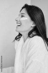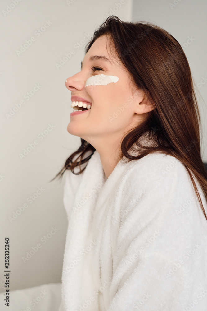 Young cheerful woman in white bathrobe with cosmetic mask on face happily looking aside in modern cozy hotel