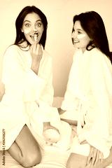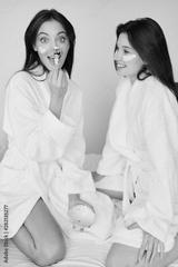 Two young joyful women with dark hair in white bathrobes sitting on bed with cosmetic mask on faces playfully looking in camera in modern hotel