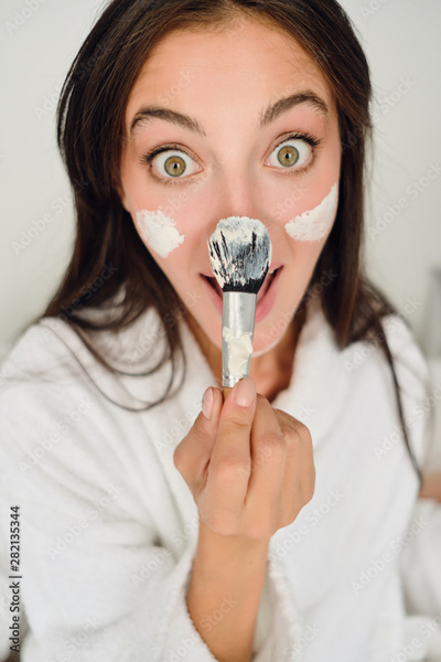 Young pretty joyful woman in white bathrobe with cosmetic mask on face holding brush near nose happily looking in camera in modern hotel