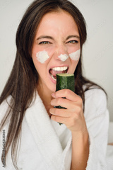 Close up young attractive woman in white bathrobe with cosmetic mask on face eating cucumber emotionally looking in camera in modern cozy hotel