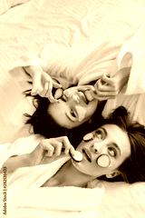 Two young pretty women with dark hair in white bathrobes lying in bed with cosmetic mask on faces dreamily eating slices of cucumber together in modern hotel
