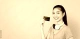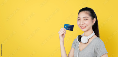 Happy Asian woman wearing headphones on the neck and holding credit card payment on yellow background with copy space.