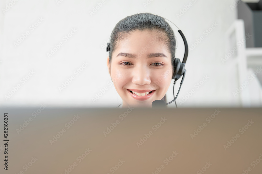 Smiling Asian woman consultant wearing microphone headset of customer support phone operator at workplace.
