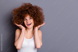 Portrait of funny funky lady touch palms she her hands hair look enjoy wear tank-top isolated over grey background