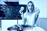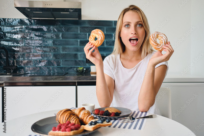 Young pretty blond woman in white T-shirt holding sweet buns in hands amazedly looking in camera at the table with breakfast at modern home