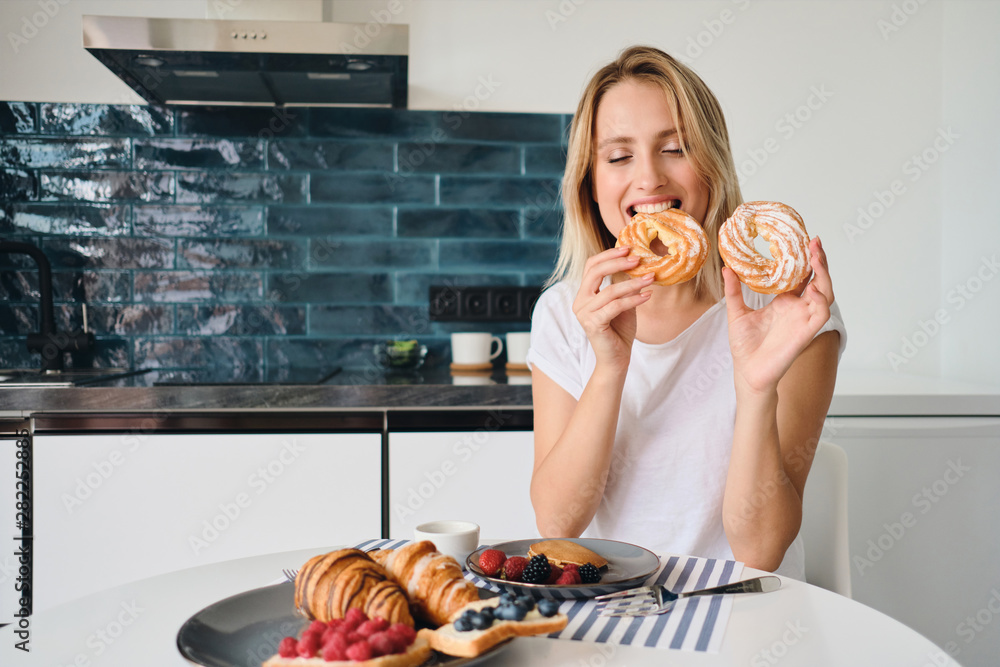 Young pretty blond woman in white T-shirt happily eating sweet buns sitting at the table with breakfast at modern home