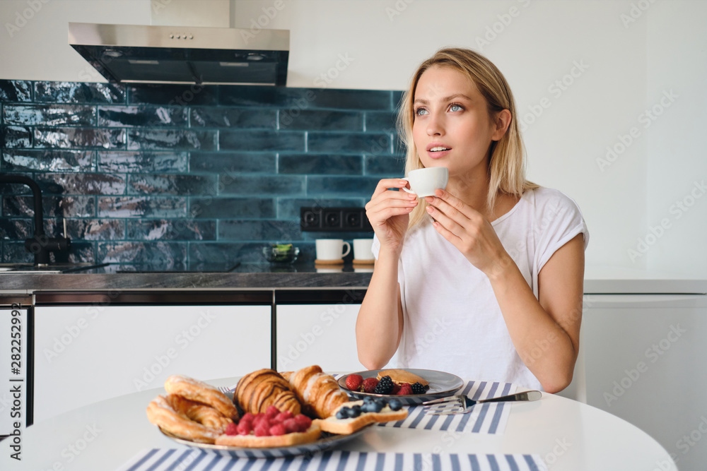 Young attractive blond woman in white T-shirt dreamily looking aside with cup of coffe in hand at the table with breakfast at modern home