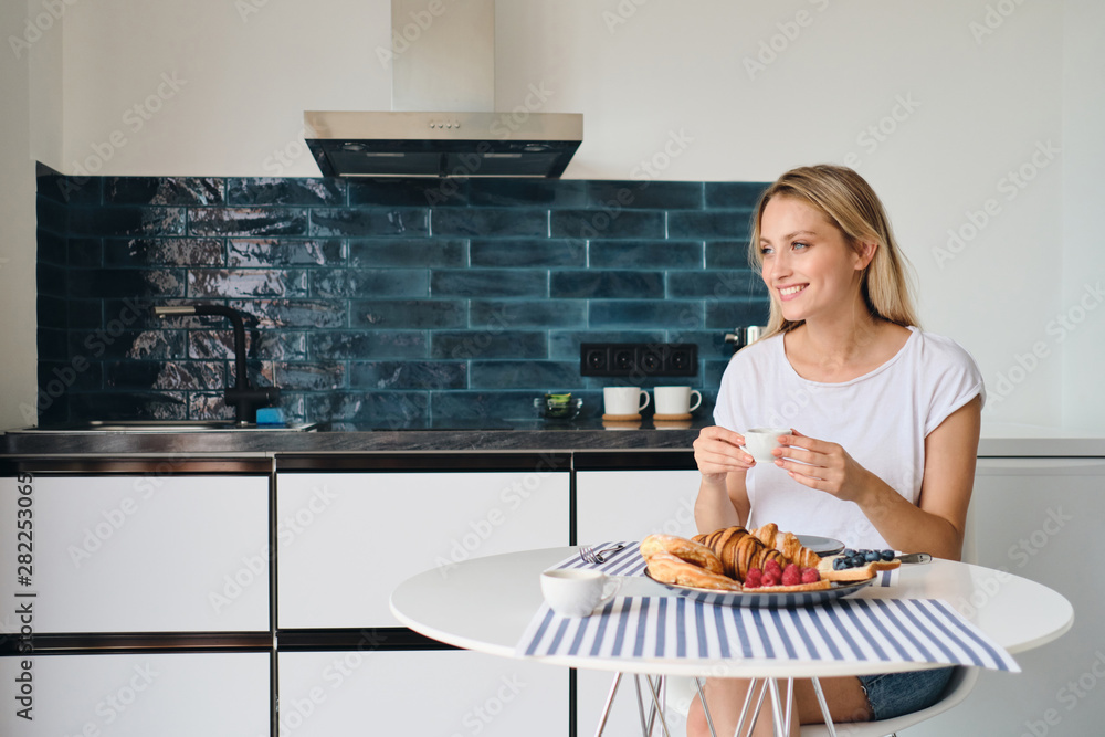 Young beautiful smiling blond woman in white T-shirt happily looking aside with cup of coffe in hand sitting at the table with breakfast at modern cozy home