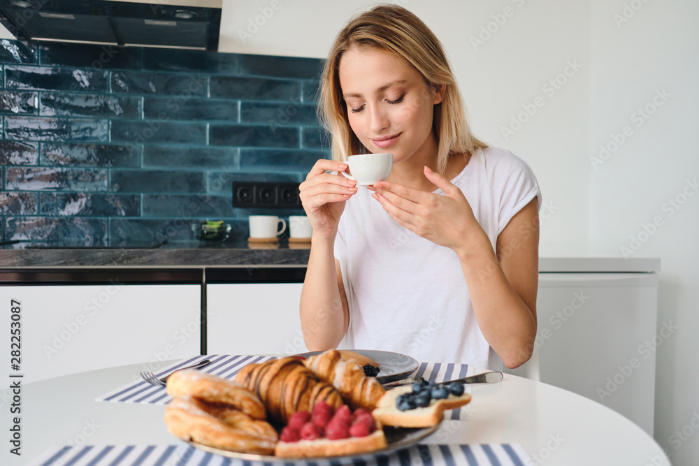Young beautiful blond woman in white T-shirt dreamily smelling fresh coffee holding cup in hand at the table with breakfast at modern cozy home