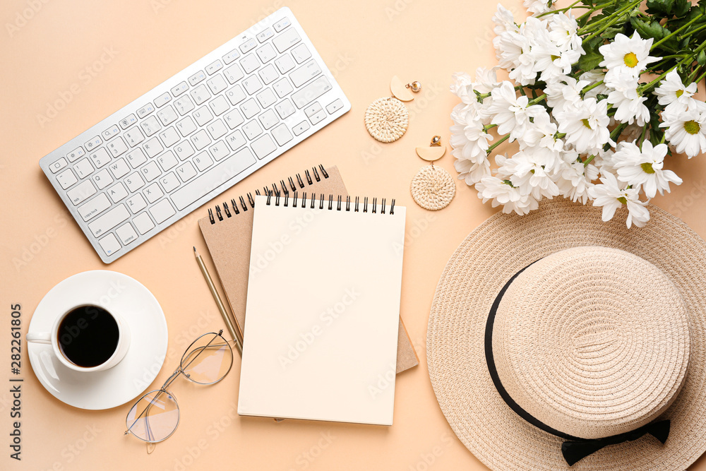 Computer keyboard with notebooks, cup of coffee and female accessories on color background