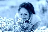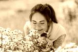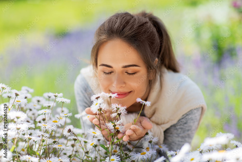 gardening and people concept - close up of happy young woman smelling chamomile flowers at summer garden