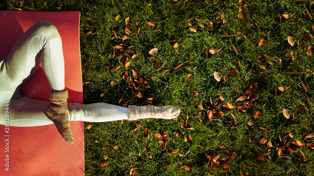 Yoga girl in autumn park with yoga mat on green carpet with fallen yellow leaves. Funny autumn legs wearing woolen socks and doing yoga in cold autumn park in the morning