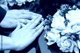 Hands of Bride and Groom With Wedding Rings on a surface of a black car.