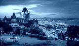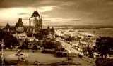 The Chateau Frontenac in Quebec city and Terrace Dufferin in sunset.