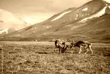 Landscape with wild reindeer. Summer Svalbard. with massive antlers horns deer On the Sunset, Norway. Wildlife scene from nature Spitsbergen