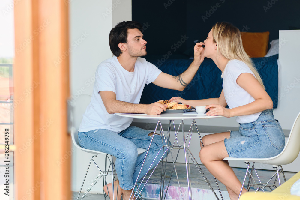 Young attractive brunette man dreamily feeding pretty blond woman. Beautiful couple in white T-shirts sitting at the table having delicious breakfast at modern home