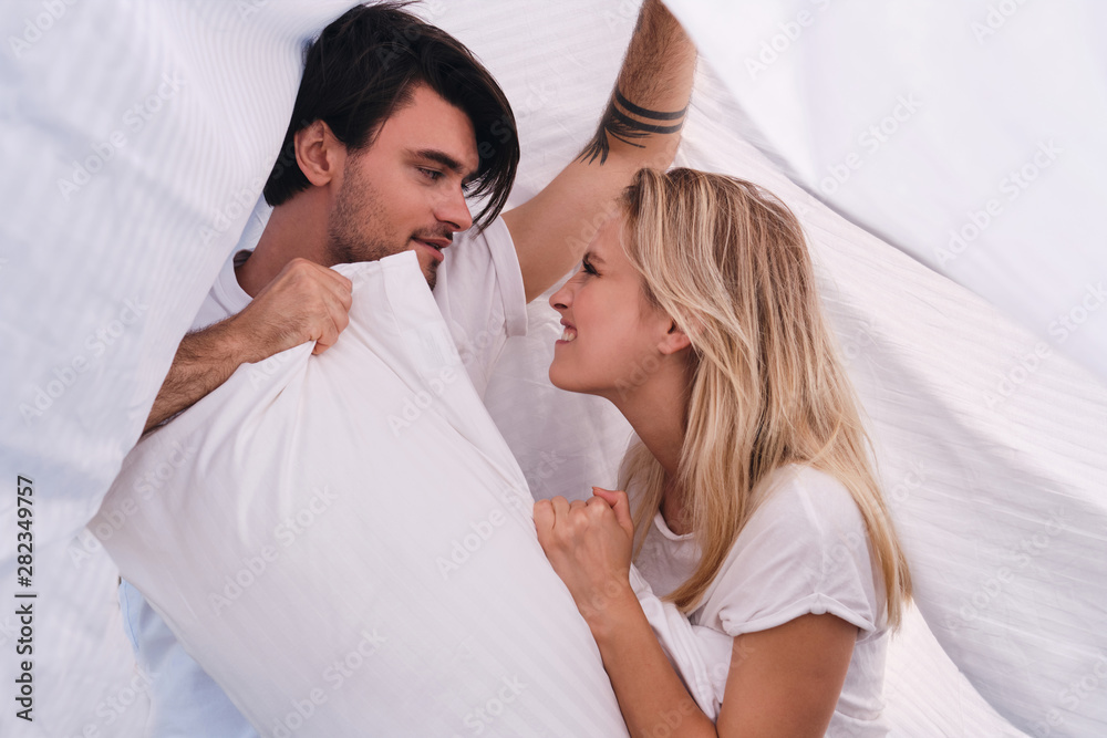 Young attractive brunette man and pretty emotional blond woman thoughtfully looking at each other and fighting for pillow lying together under blanket in bed at cozy home