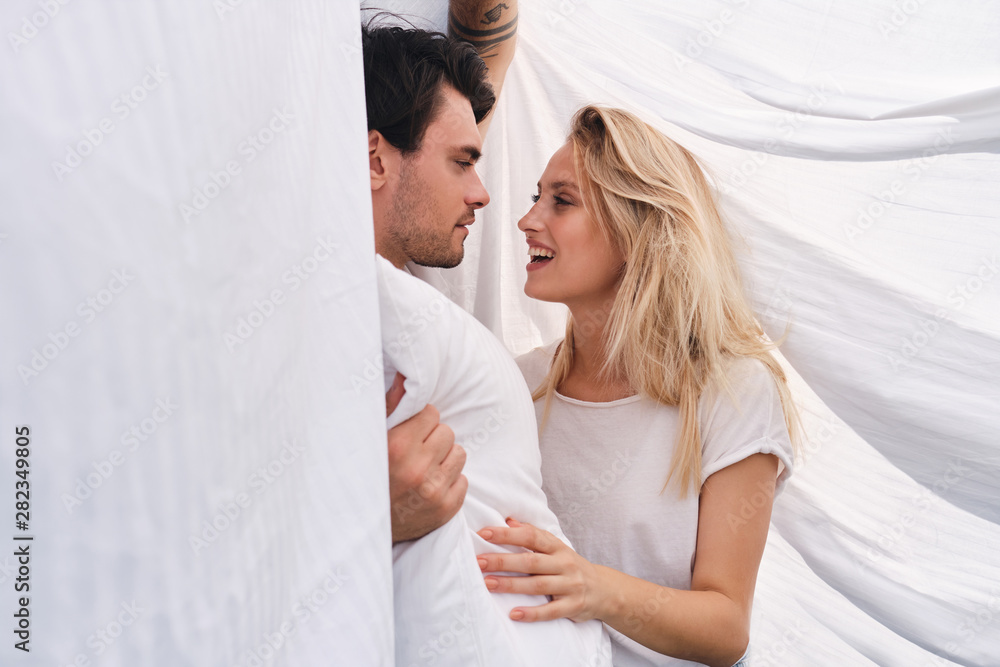 Young brunette man with pillow in hand dreamily looking at beautiful smiling blond woman lying together under blanket in bed at home