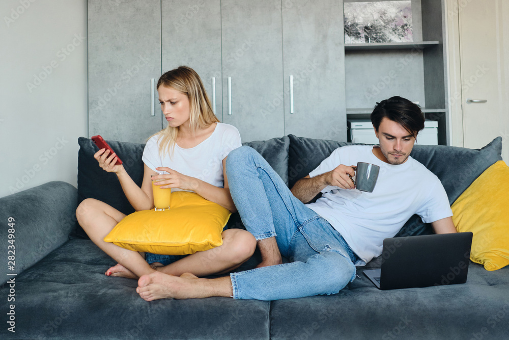 Upset blond woman with glass of orange juice in hand using cellphone while thoughtful brunette man with cup of coffee working on laptop. Young couple sitting on sofa at modern cozy home