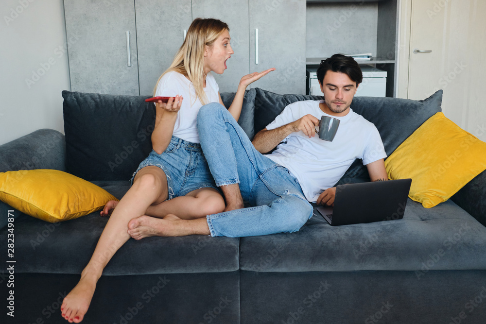 Grumpy blond woman with cellphone in hand emotionally talking to calm brunette man with cup of coffee and laptop. Young couple sitting on sofa at modern cozy home