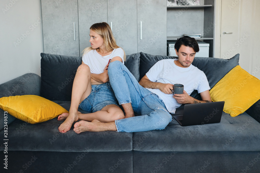 Angry blond woman sadly looking aside while brunette man with cup of coffee thoughtfully using laptop. Young couple sitting on sofa at modern cozy home