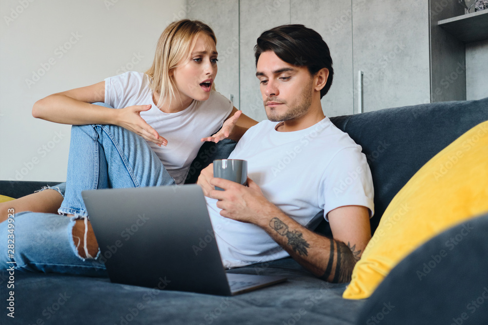 Sad emotional blond woman angrily talking to calm brunette man with cup of coffee in hands and laptop near. Young couple in bad mood sitting on sofa in home