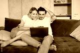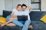 Pretty smiling blond woman and attractive brunette man happily using laptop together. Young beautiful couple sitting on sofa at modern home