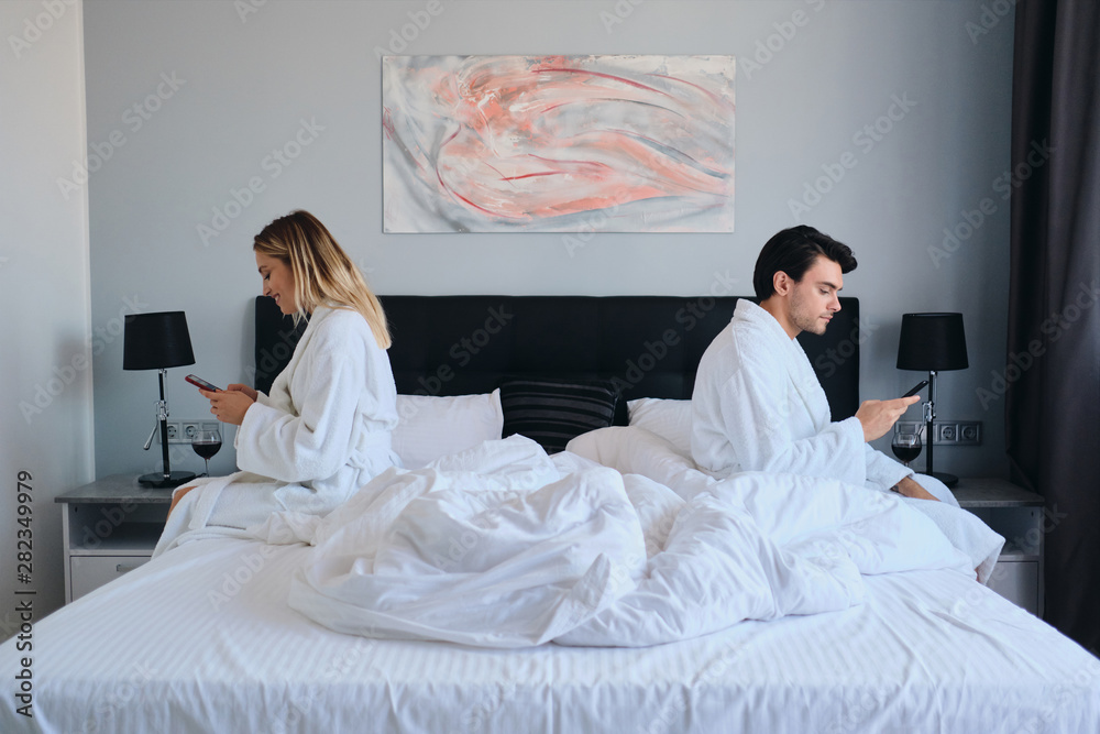 Young brunette man and pretty blond woman in white bathrobes using cellphones sitting on different sides of bed in modern hotel
