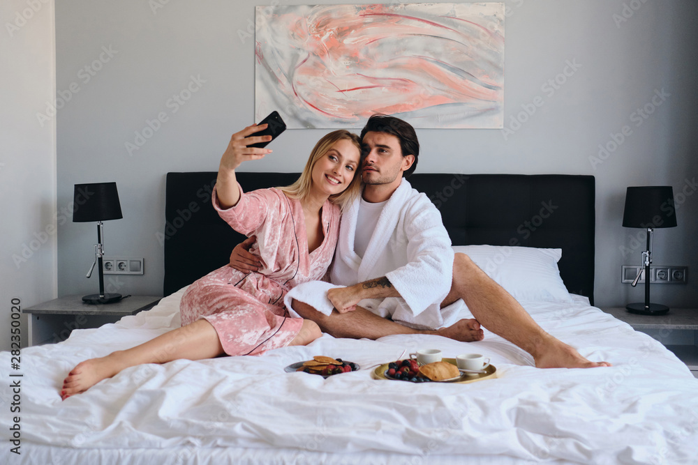 Young brunette man in white bathrobe and beautiful blond woman in pink velvet robe happily taking photo on cellphone. Attractive couple having delicious breakfast in bed in modern hotel