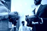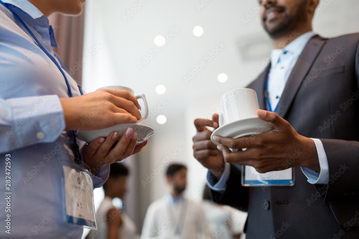 business, communication and education concept - international group of people with conference badges drinking coffee and talking at brake