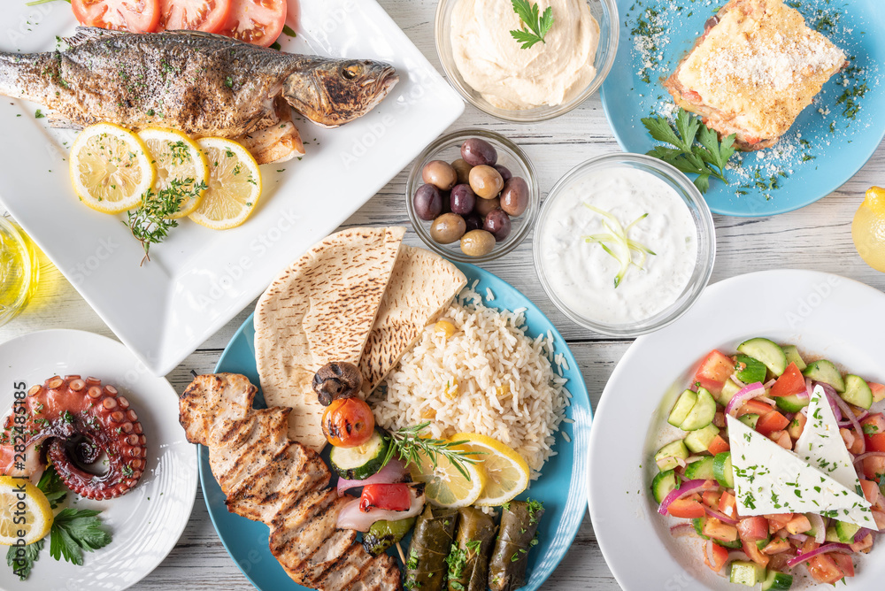 assorted popular greek plates with flat lay angle