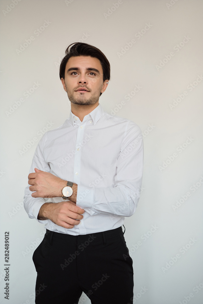 Young handsome brunette man in white shirt and black trousers with handwatch dreamily looking aside over white background alone