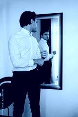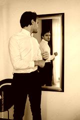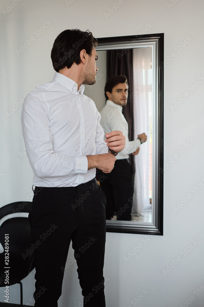 Young handsome brunette man in white shirt and black trousers dreamily looking in mirror at home