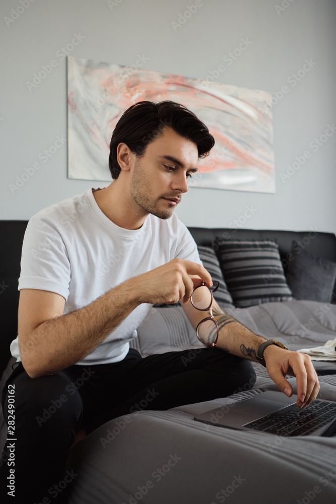 Young tired brunette man in T-shirt sitting on big bed with eyeglasses in hand thoughtfully working on laptop at home